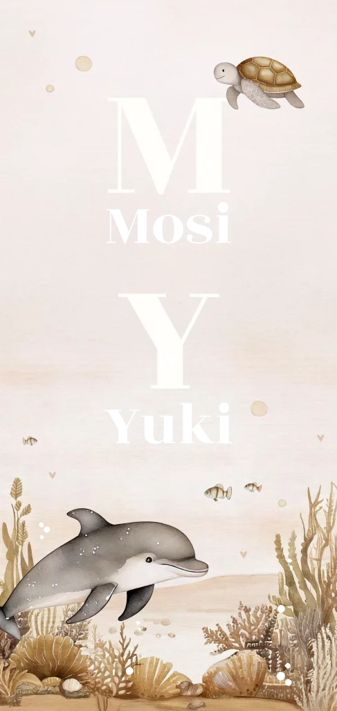 Tweeling geboortekaartje met onderwaterwereld thema met een dolfijn en schildpad. Dit langwerpige geboortekaartje Mosi en Yuki heeft de eerste letter van de naam op de voorzijde staan met daaronder de naam. De namen worden in goudfolie gedrukt. Pas de kleuren, lettertypes en afbeeldingen makkelijk zelf aan! Hulp nodig? We staan voor je klaar!