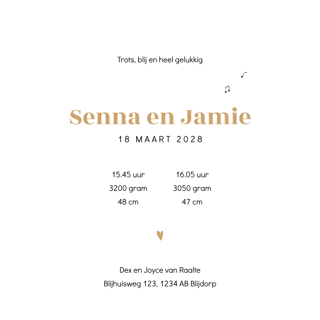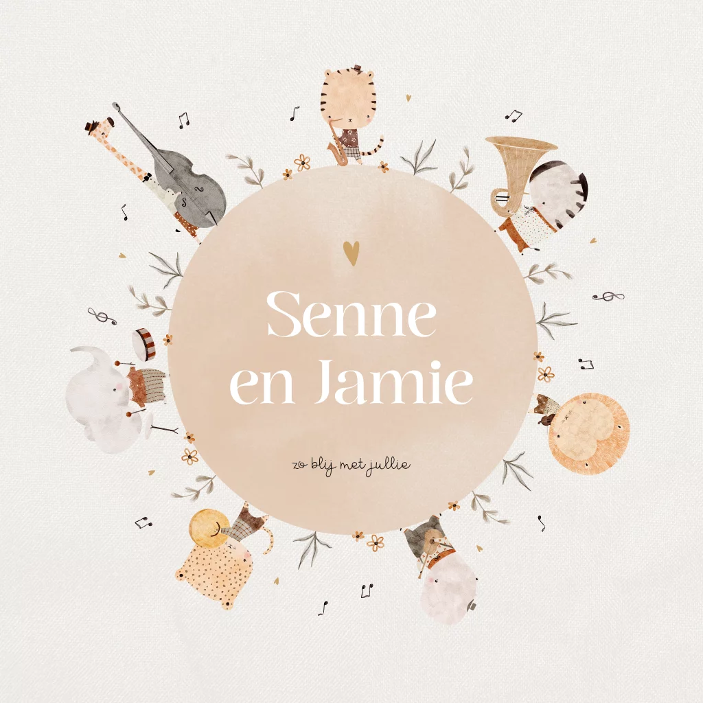 Vrolijk geboortekaartje voor een tweeling met jungle dieren. Dit geboortekaartje is voorzien van een wereldbol met daaromheen allerlei dieren waaronder een olifant, giraffe en leeuwtje. De dieren bespelen muziekinstrumenten waaronder een trommel, trompet en viool. De muzieknootjes en hartjes maken dit vrolijke en schattige geboortekaartje Senne en Jamie helemaal compleet. Door de neutrale kleuren is dit geboortekaartje voor een tweeling unisex en dus geschikt voor zowel jongens als meisjes.