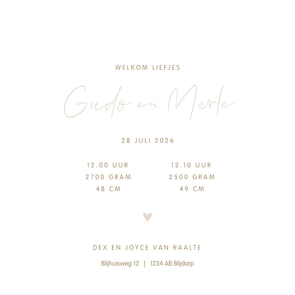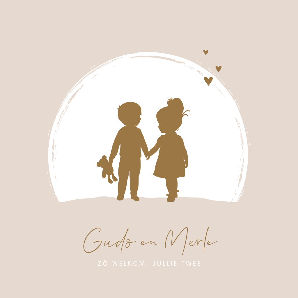 Unisex geboortekaartje voor een tweeling. Op dit kaartje Gudo en Merle een silhouet van de tweeling: een jongen en een meisje voor een grote zon. Het jongetje heeft in zijn ene hand een knuffel en in zijn andere de hand van zijn zus. De kleine hartjes maken het kaartje helemaal af. Pas het rondhoek kaartje naar je eigen smaak aan de editor. Ook mogelijk in een andere gezinssamenstelling. Hulp nodig? Laat het ons weten!