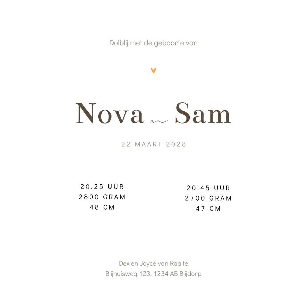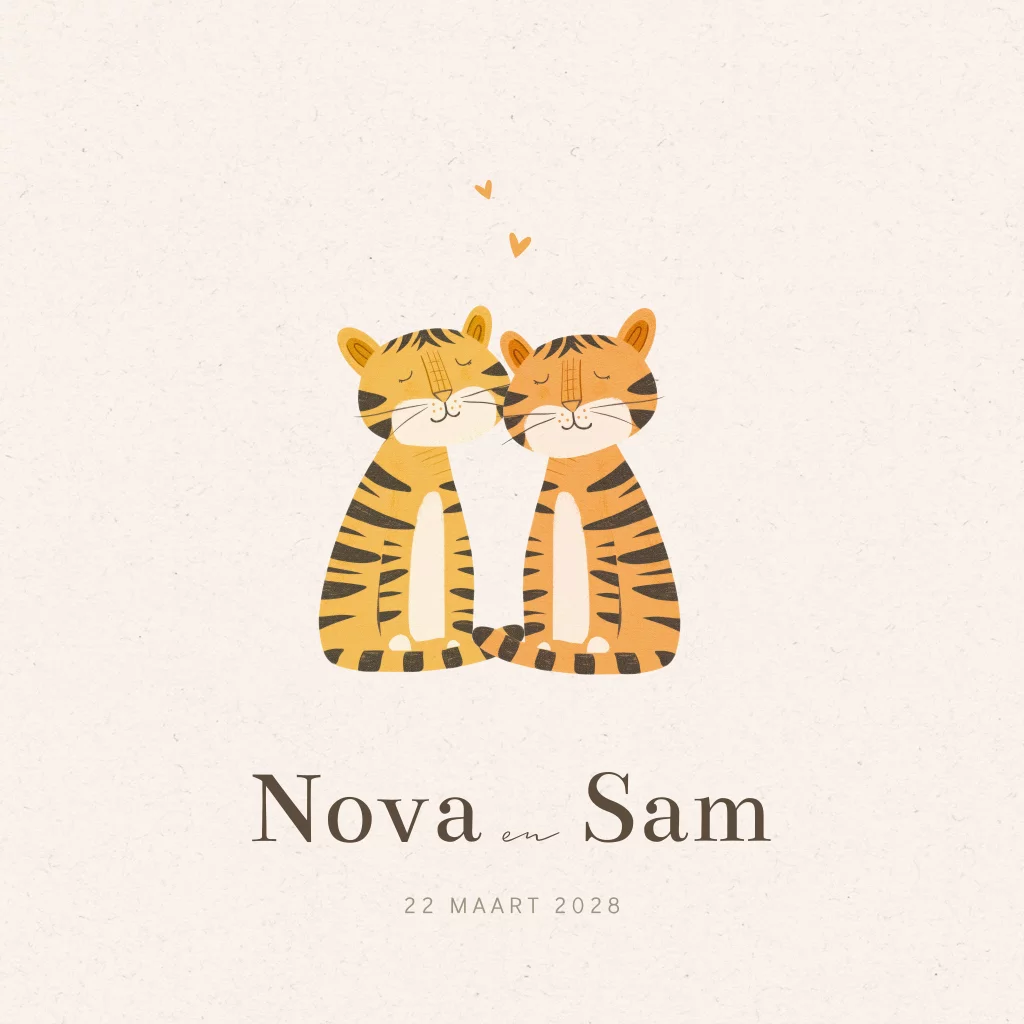 Op dit tweeling geboortekaartje Nova en Sam staat een illustratie van twee schattige tijgers. De achtergrond heeft een mooie lichte achtergrond en het kaartje is verder overwegend rustig. Dit tweeling geboortekaartje is unisex en daardoor geschikt voor zowel een jongens tweeling als een meisjes tweeling. Pas de teksten, kleuren en lettertypes naar je eigen smaak aan in de editor. Hulp nodig? Bel, mail of chat ons gerust!