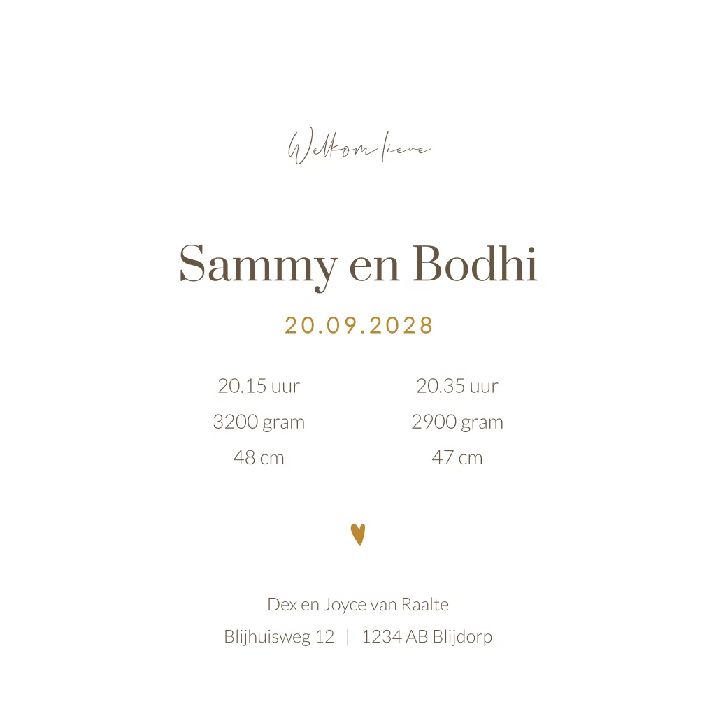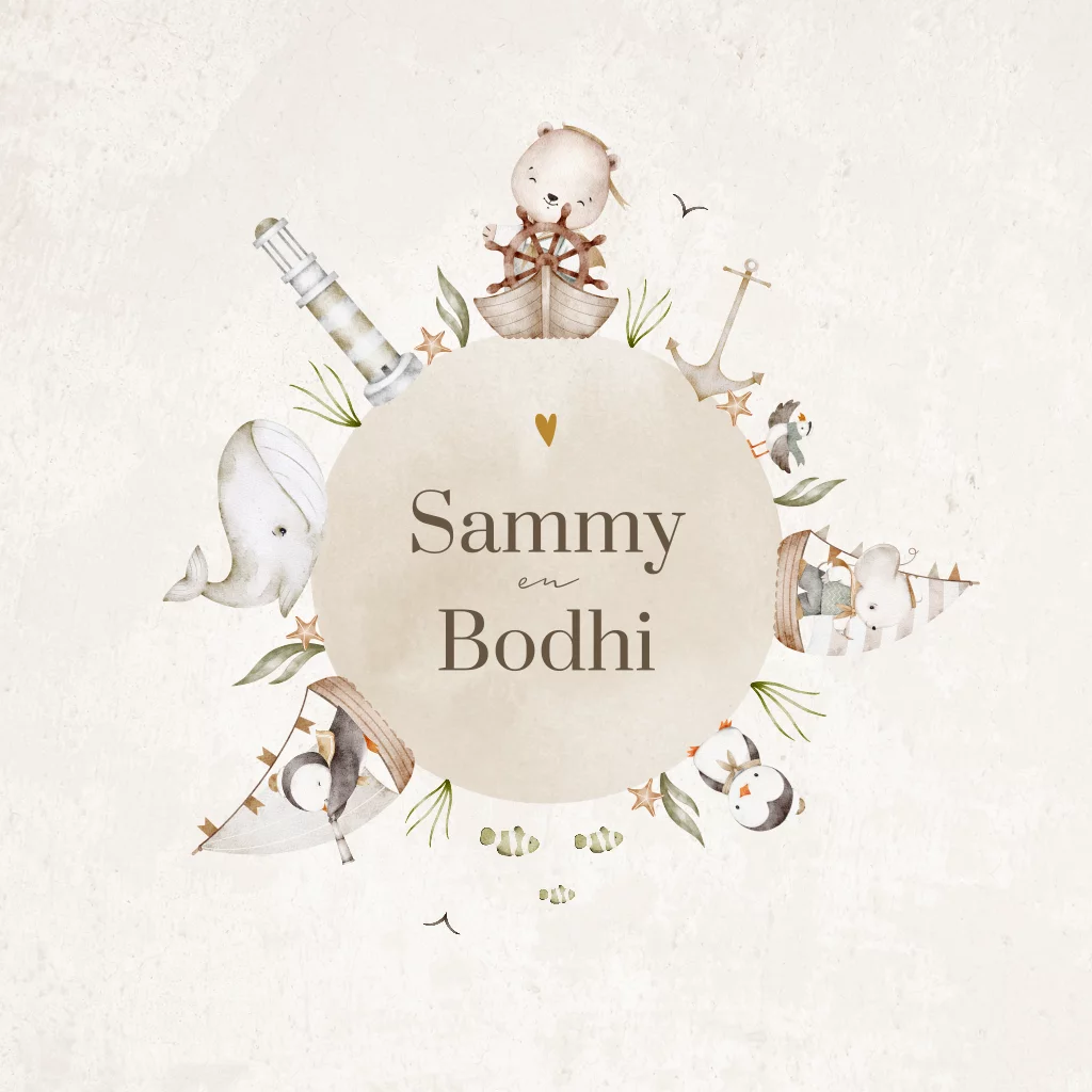 Lief unisex geboortekaartje voor een tweeling met verschillende vrolijke zee en bos dieren op een wereldbol, waaronder een walvis, pinguïn, muisje en konijntje. De dieren varen op een bootje rond de wereld, met een verrekijker, op zoek naar avontuur! Pas dit tweeling geboortekaartje Sammy en Bodhi eenvoudig aan in de editor.