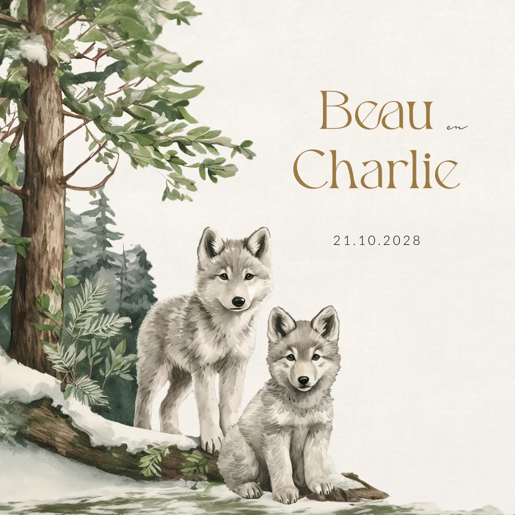 Op zoek naar een avontuurlijk, winters geboortekaartje voor een tweeling? Dit prachtige unisex geboortekaartje Beau en Charlie is perfect voor de aankondiging van de geboorte van jullie twee kindjes. Op dit kaartje zie je twee wolven welpjes in de sneeuw in een bosrijke omgeving. Met de mogelijkheid om de kleuren, teksten en lettertypes aan te passen in de editor, kunnen jullie dit geboortekaartje voor jullie jongen(s) en/of meisjes(s) eenvoudig personaliseren naar jullie eigen smaak. De donkergroene envelop maakt het geheel compleet. Perfect voor de aankondiging van jullie twee kleine welpjes!