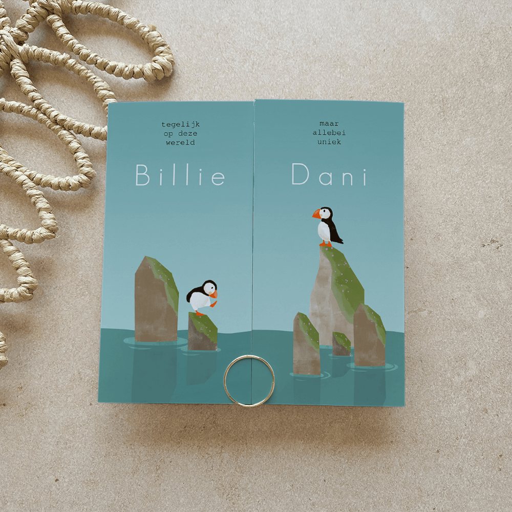 Op zoek naar een origineel en uniek tweeling geboortekaartje? Dan is dit hippe geboortekaartje Billie en Dani met papegaaiduikers zeker iets voor jullie! Het geboortekaartje is origineel en bijzonder tegelijk door de theatervouw en zo hebben jullie tweeling jongens samen maar toch ook zelf een geboortekaartje, hoe leuk! Sluit dit luikkaartje met een hippe ronde paperclip. De paperclip wordt niet standaard meegeleverd maar kan hier worden besteld.