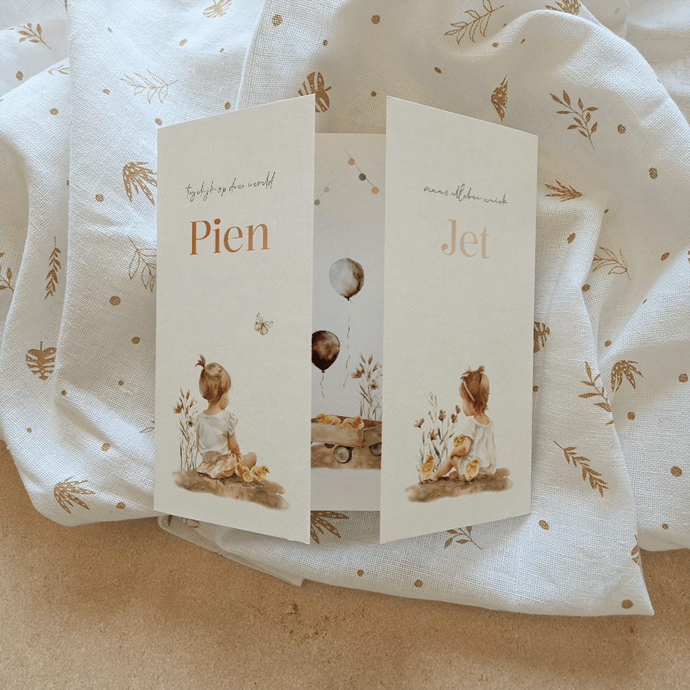 Origineel tweeling geboortekaartje voor twee meisjes. Dit geboortekaartje Pien en Jet is een luikkaartje waardoor je beide dochters alleen maar toch ook samen hun kaartje hebben. Zet op beide zijdes de geboorte informatie. Op het tweeling geboortekaartje zie je op de voorzijde een aquarel tekening van twee meisjes en op de binnenzijde een aquarel tekening van een bolderkar met kuikentjes, ballonnen en een slinger. Sluit dit luikkaartje met een hippe ronde paperclip. De paperclip wordt niet standaard meegeleverd maar kan hier worden besteld.