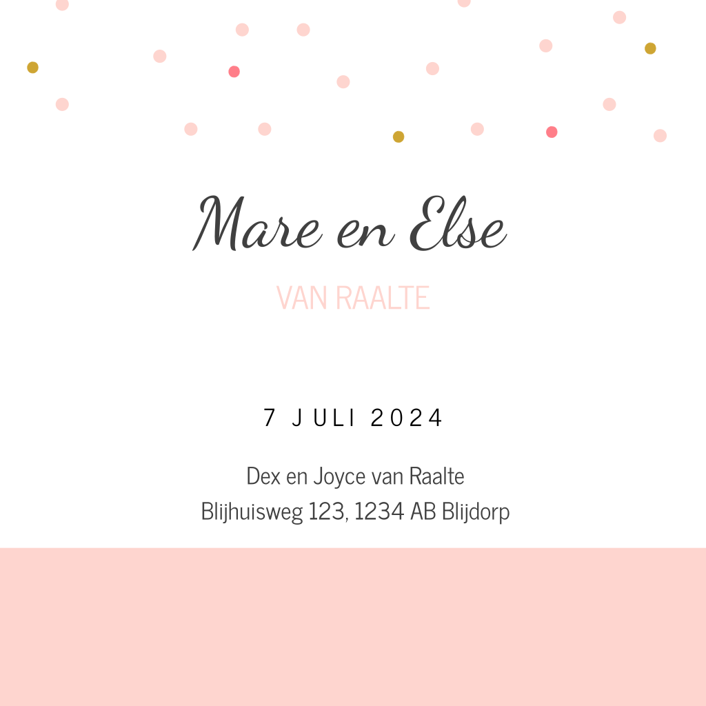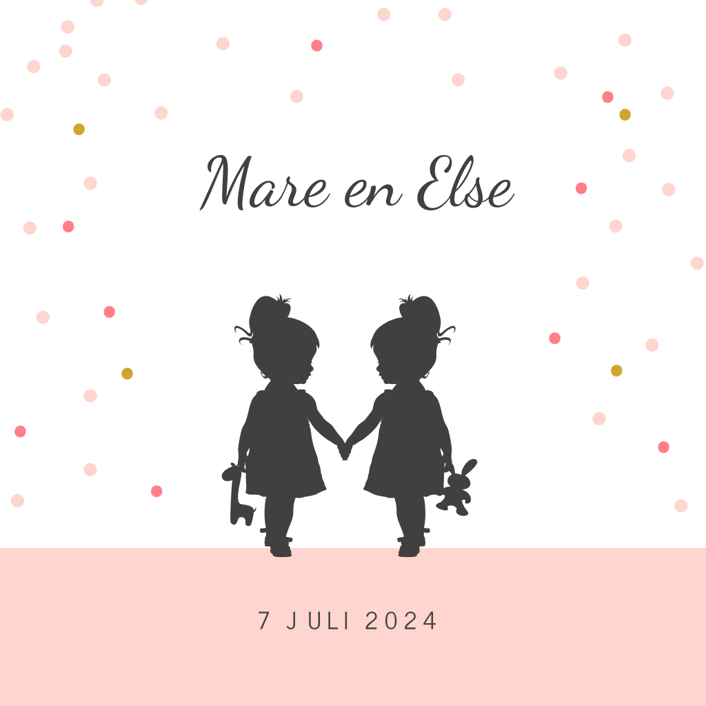 Hip en vrolijk tweeling geboortekaartje met de silhouetjes van twee meisjes. Deze schattige tweeling houdt elkaars handje vast en elk meisje heeft een knuffeltje in de hand. Aan de binnenkant van deze babykaart Mare en Else staan geboorte symbolen. Deze kaart is gemakkelijk naar eigen wens aan te passen