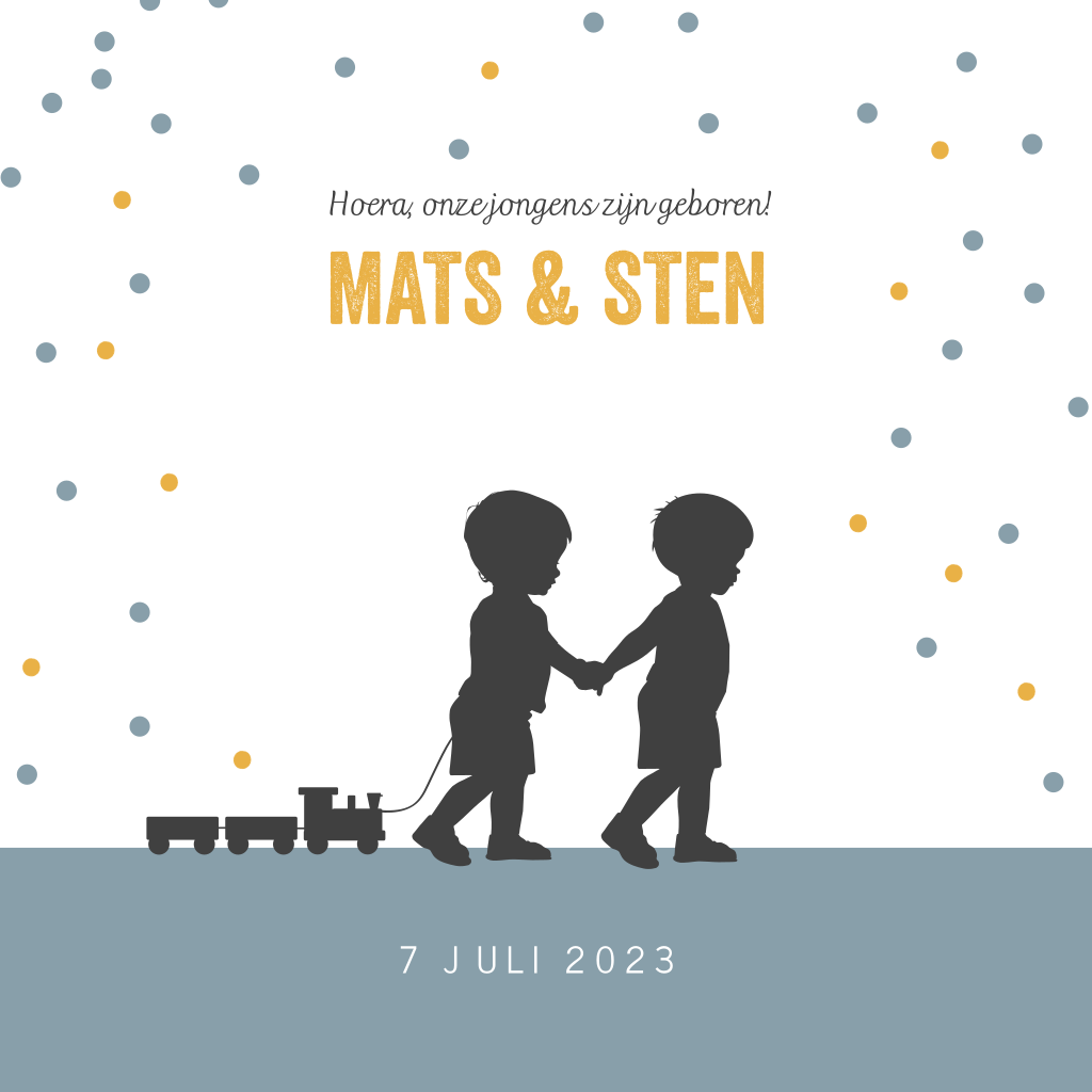Hip en vrolijk tweeling geboortekaartje met de silhouetjes van twee jongens. Deze tweeling houdt elkaars handje vast en één van de zoontjes houdt een treintje vast. Aan de binnenkant van deze babykaart Mats en Sten staan dezelfde stippen als aan de voorkant. Deze kaart is gemakkelijk naar eigen wens aan te passen