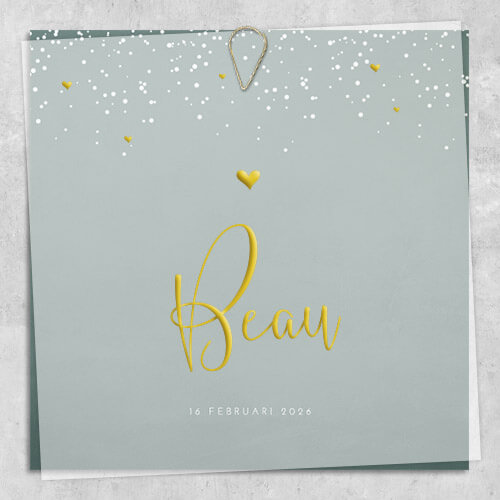Uniek jongens geboortekaartje Beau met op de voorzijde een trendy blauwe achtergrond met een ruwe structuur en een stipjes patroon. Op de achterzijde is ruimte voor de geboortegegevens. Op het velletje van kalkpapier worden de kleine hartjes en de babynaam gedrukt in goudfolie.