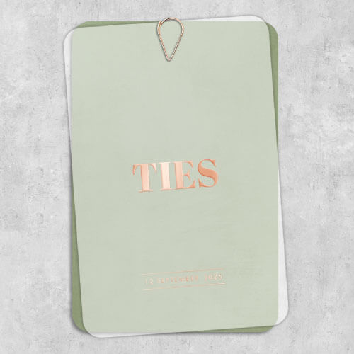 Geboortekaartje Ties voor een jongen met een basic design met stoere groene achtergrond en afgeronde hoeken. Op de achterzijde is ruimte voor de geboortegegevens. Op de kalkpapieren cover worden de naam en de geboortedatum gedrukt in écht roséfolie. Dit kun je naar je eigen smaak wijzigen naar goudfolie, koperfolie, zilverfolie of zwartfolie. Foliedruk en kalkpapier is een erg mooie combinatie.