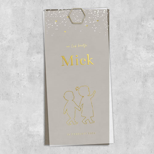 Geboortekaartje Mick voor een jongen met een stoere achtergrondkleur en kleine spetters. Op de achterzijde is ruimte voor de geboortegegevens. Op de kalkpapier cover van semitransparant papier staat een outline silhouet van een grote zus hand in hand met een klein baby broertje. Het silhouet en de teksten op deze kalkpapieren cover worden gedrukt in écht goudfolie. Dit kun je naar je eigen smaak wijzigen naar roséfolie, koperfolie, zilverfolie of zwartfolie.