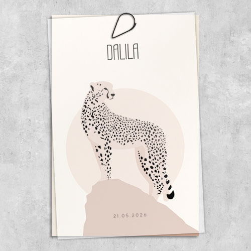 Stoer en bijzonder kalkpapier geboortekaartje voor een meisje met cheetah / jachtluipaard in zwart hoogglans folie. De achterkaart van dit geboortekaartje Dalila heeft mooie roze kleuren.