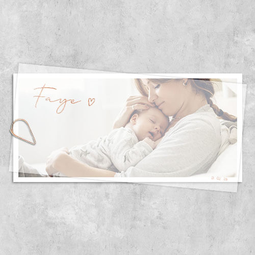 Foto geboortekaartje voor een jongen of meisje. Op de achterzijde van dit geboortekaartje Faye is ruimte voor de geboortegegevens van je zoon of dochter. Op de voorzijde van het kalkpapieren geboortekaartje wordt de naam en het hartje in roséfolie gedrukt. Pas de kleur van de folie aan naar eigen wens! Je kunt kiezen uit zilver, goud, koper en zwart.