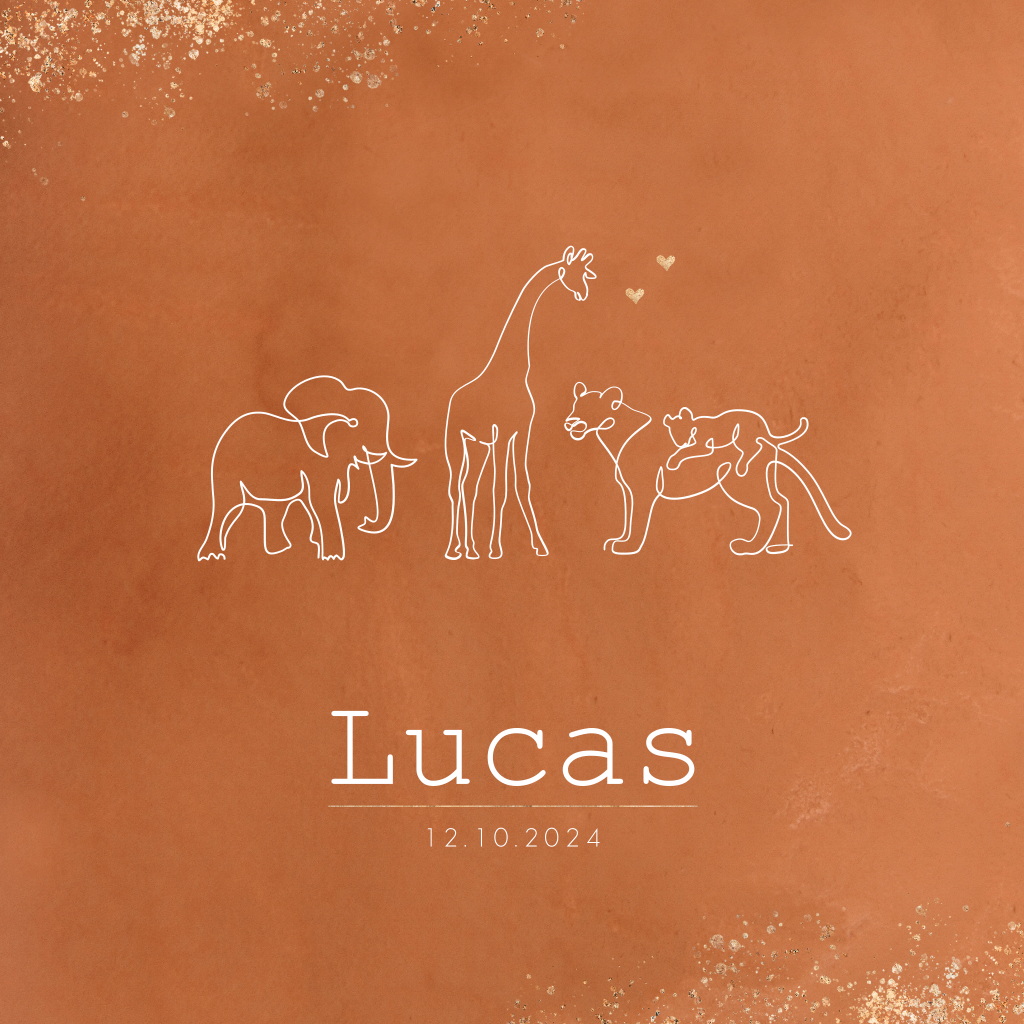 Hip dieren geboortekaartje voor een zoon. Op de achtergrond een trendy roestbruine kleur en lijntekeningen van een olifantje, giraffe en een leeuw met een klein welpje op zijn rug. Dit babykaartje Lucas is onderdeel van onze pocketfold serie "Roest". Deze hoofdkaart plak je in het pocketfold mapje en bevat daarom geen bedrukking op de achterzijde. Combineer met extra kaartjes uit deze serie om zo je eigen set geboortekaartjes compleet te maken.