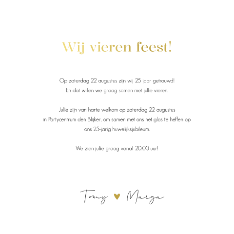 Benieuwd naar meer uitnodigingskaarten voor een jubileum? Bekijk onze uitgebreide collectie jubileumkaarten of uitnodigingskaarten voor een andere gelegenheid. Of ontwerp helemaal zelf je eigen jubileumkaart voor 50 jaar getrouwd vanaf een blanco kaart.