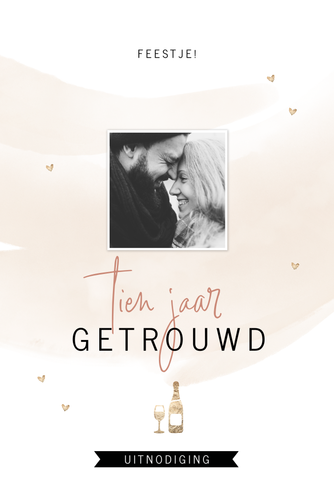 Aquarel jubileumkaart voor 10 jaar getrouwd met foto. De proostende wijnglazen en gouden hartjes maken de kaart extra feestelijk.
