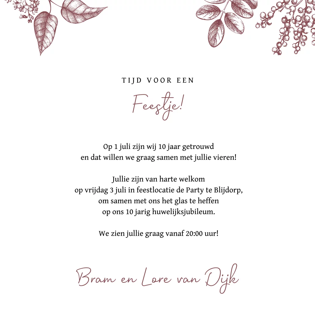 Jubileum uitnodiging 10 jaar getrouwd bordeaux rood met bloemen