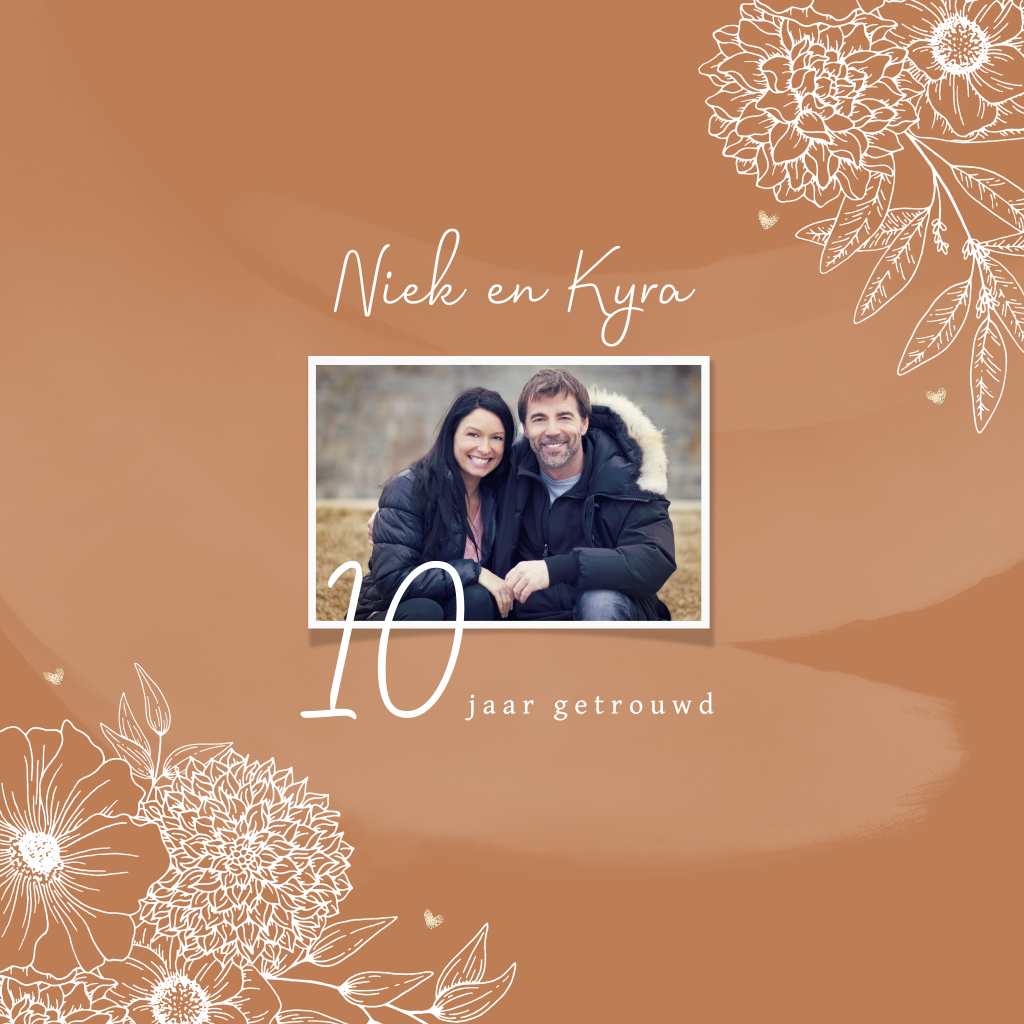Uitnodiging voor een 10-jarig huwelijksjubileum met eigen foto en sierlijke, getekende bloemen. Op de achtergrond een trendy terra kleur. De kleine gouden hartjes maken het kaartje helemaal af. Je kunt deze kaart naar je eigen smaak aanpassen in de editor.