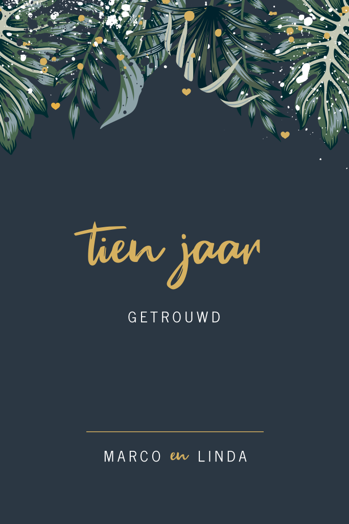 Al weer 10 jaar getrouwd! Met deze stijlvolle kaart met mooie botanische bladeren nodig je al je gasten uit voor jullie feest. Op deze uitnodiging een warme donkerblauwe achtergrond, mooie bladeren in verschillende groentinten en goudkleurige hartjes en spetters. De teksten in wit en goudkleur staan perfect in combinatie met de achtergrondkleur. Mocht je nog aanpassingen willen; bij deze 10 jaar getrouwd kaart voor een tinnen bruidspaar zijn kleuren, teksten en afbeeldingen eenvoudig aan te passen in onze editor.