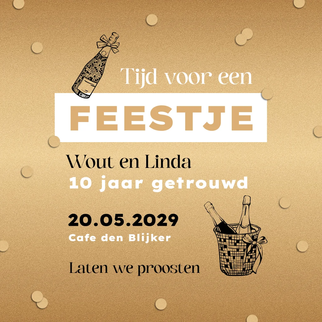 10 jaar getrouwd? Tijd voor een feestje! Deze huwelijksjubileum uitnodiging heeft een goudlook met gouden confetti en champagne. De combinatie van de goudenlook en de antiek gouden envelop zorgen voor een chique uitstraling.
