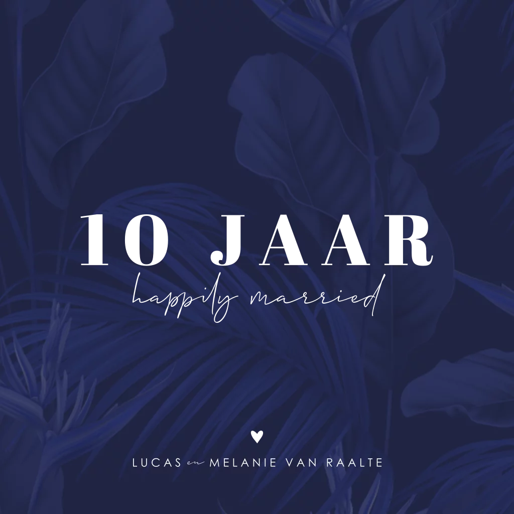 Happily married! 10 jaar getrouwd uitnodiging met goudfolie en bladeren op de achtergrond. Deze jubileumuitnodiging met afgeronde hoeken kun je eenvoudig zelf aanpassen, net als de kleur van de foliebedrukking.
