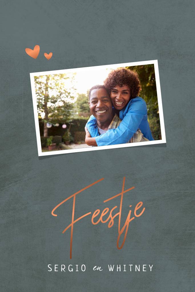 Feestje! Hippe uitnodigingskaart om jullie huwelijksjubileum te vieren. Deze jubileumkaart heeft een donkere, betonlook achtergrond met tekst in wit en koperkleur. Een mooie combinatie. Plaats jullie eigen mooiste foto in het kader. Liever andere kleuren of lettertypes? Dit is gemakkelijk aan te passen in de editor.