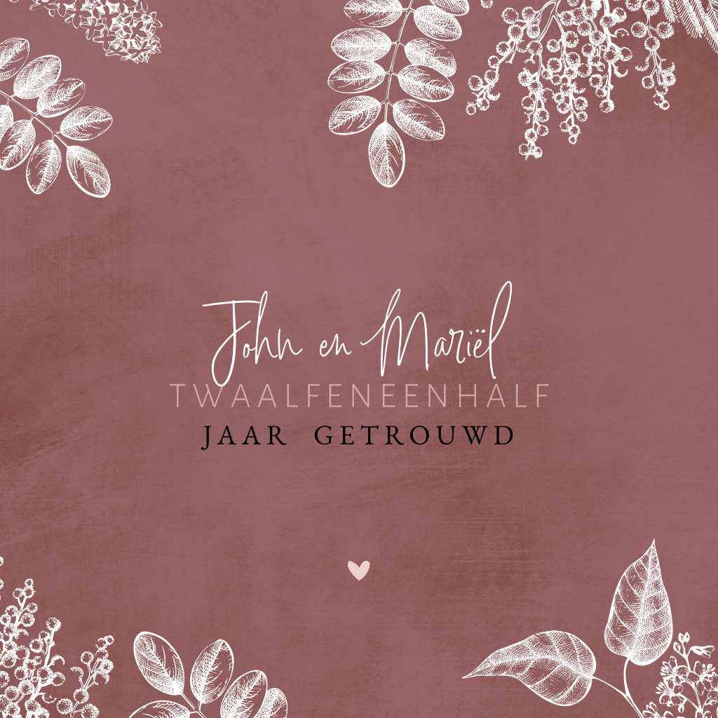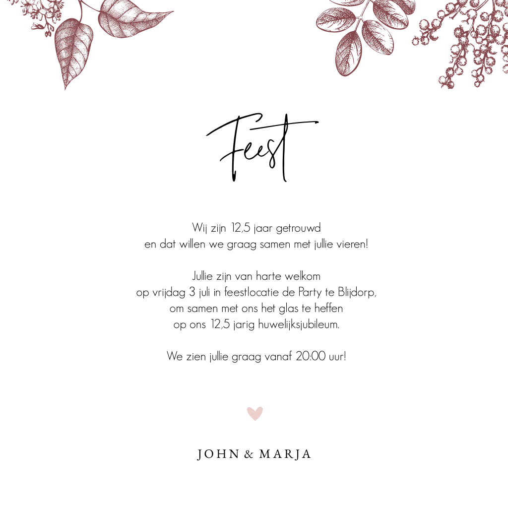 Romantische jubileum uitnodiging met vrolijke hippe bordeaux rode bloemen en sierlijke letters. De gebruikte kleurencombinatie van donkerrood, groen en wit geven deze uitnodiging voor een 12,5 jaar huwelijksjubileum een warme sfeervolle uitstraling.