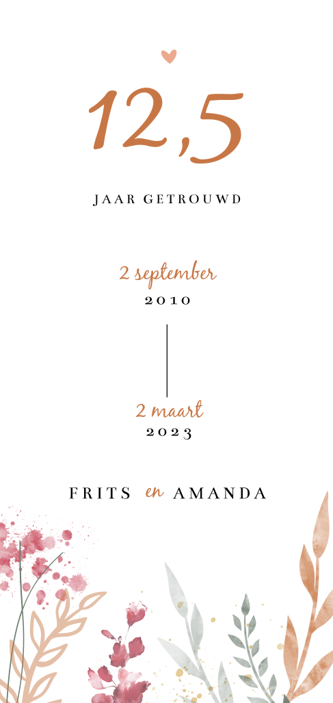 Hippe jubileumkaart voor 12,5 jaar getrouwd. Op deze uitnodiging staan mooie aquarel bloemen. Deze kaart is perfect voor een koperen huwelijksjubileum, maar ook te gebruiken voor andere bruiloftsjaren. De teksten zijn gemakkelijk aan te passen.