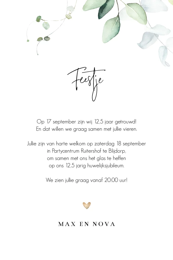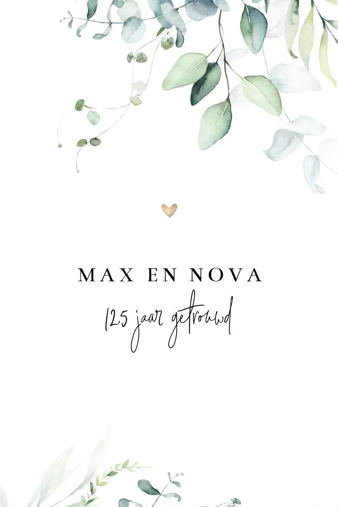 Rustig jubileumkaartje met botanische bloemen en planten in groen tinten. Het kleine hartje maakt de uitnodiging af. Deze 12,5 jaar getrouwd kaart is eenvoudig aan te passen.