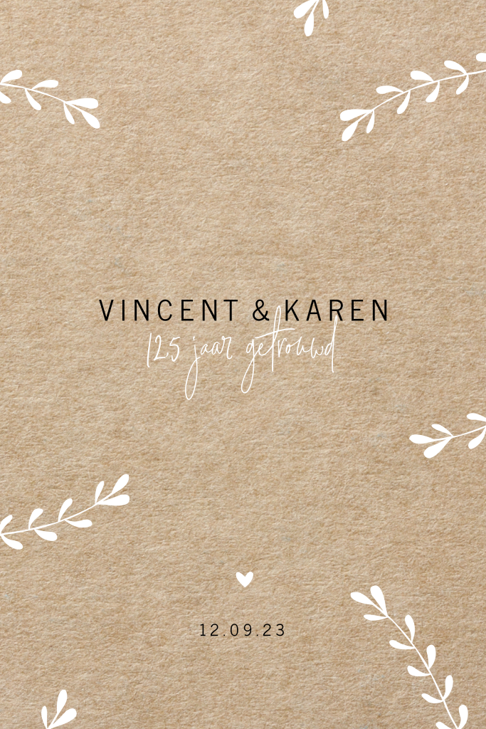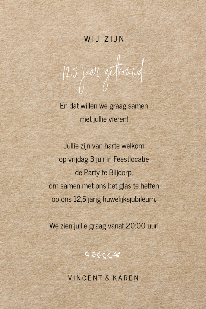 Rustig jubileumkaartje met witte takjes op een kartonnen achtergrond. Het kleine hartje maakt de uitnodiging af. Deze 12,5 jaar getrouwd kaart is tijdloos en eenvoudig aan te passen.
