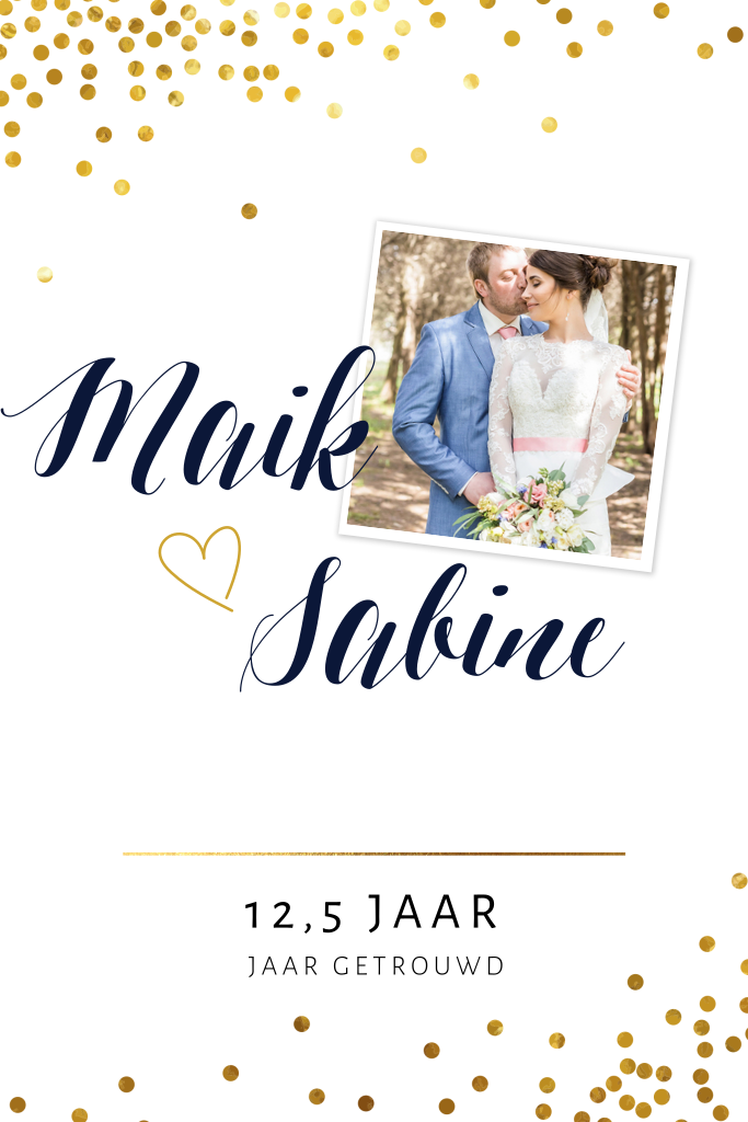 Mooie uitnodiging voor een 12,5-jarig huwelijksfeest. Op de voorkant van de kaart staat een eigen foto en goudkleurige feestelijke stipjes. De namen staan geschreven in een speels geschreven lettertype.