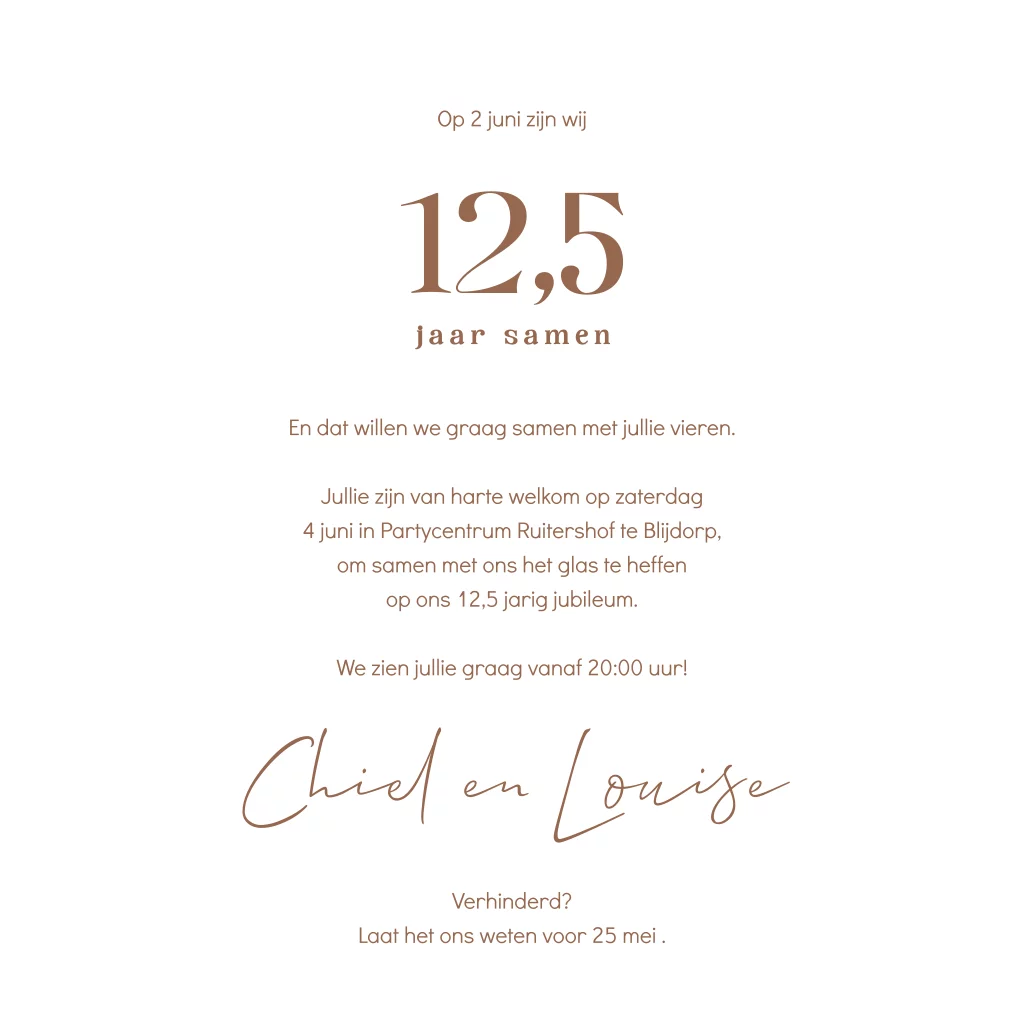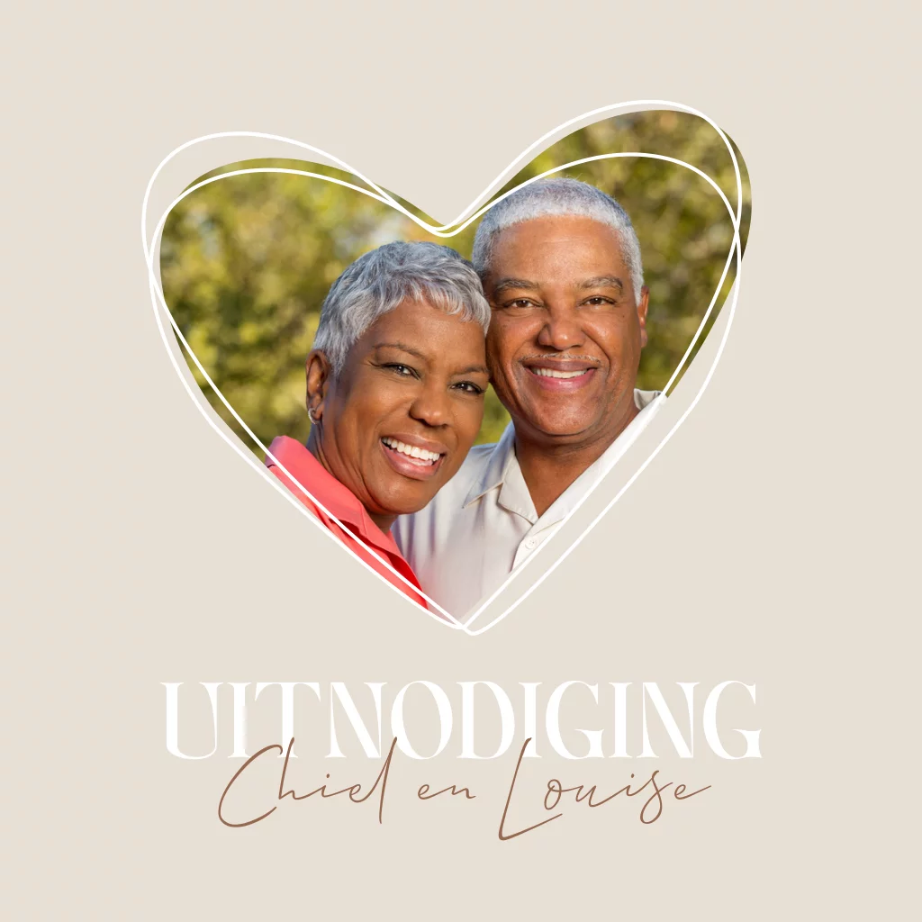 Een trendy uitnodiging voor een huwelijksjubileum met een foto in hartjesvorm. Deze kaart heeft een mooie beige achtergrond kleur. Op de binnenzijde is ook ruimte voor een eigen foto. Deze uitnodiging is te gebruiken voor alle jubileumjaren of om te vieren dat je zoveel jaar samen bent. Teksten en kleuren zijn makkelijk aan te passen in onze editor.