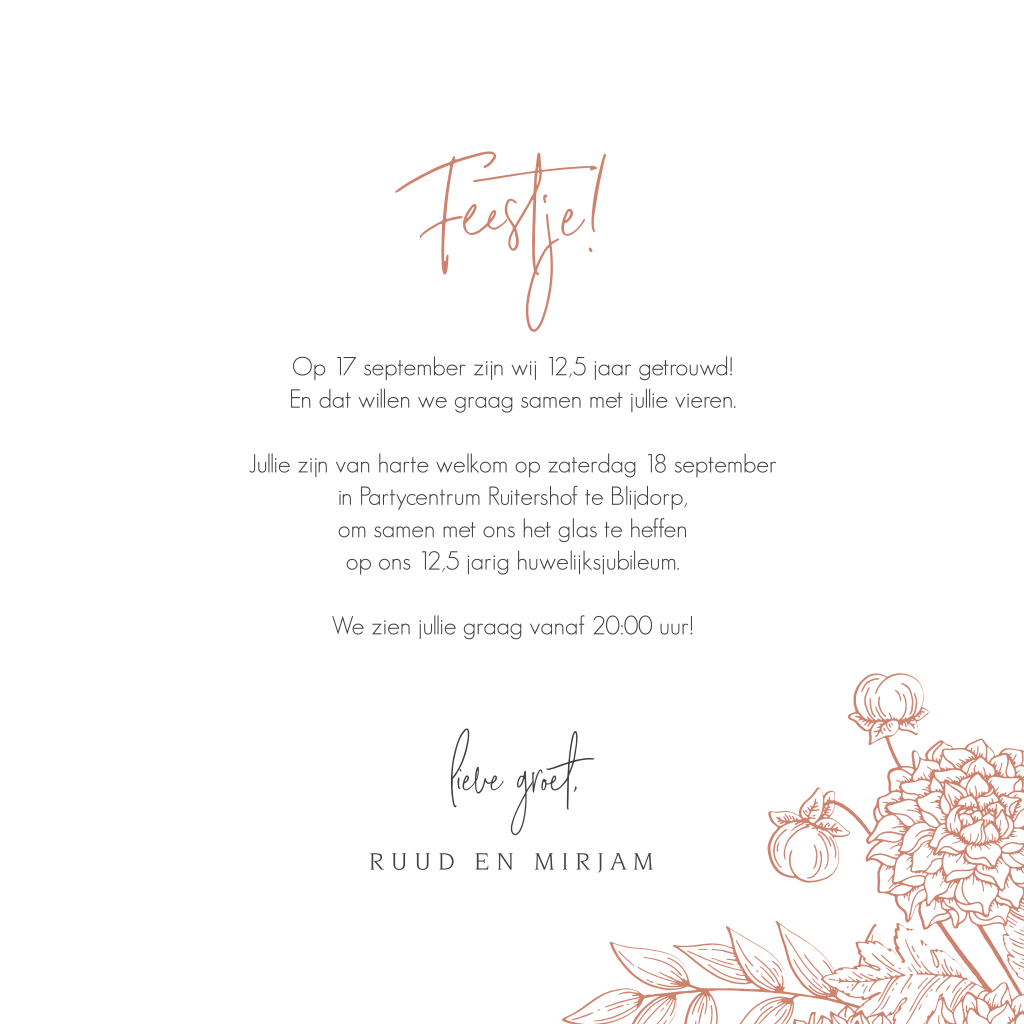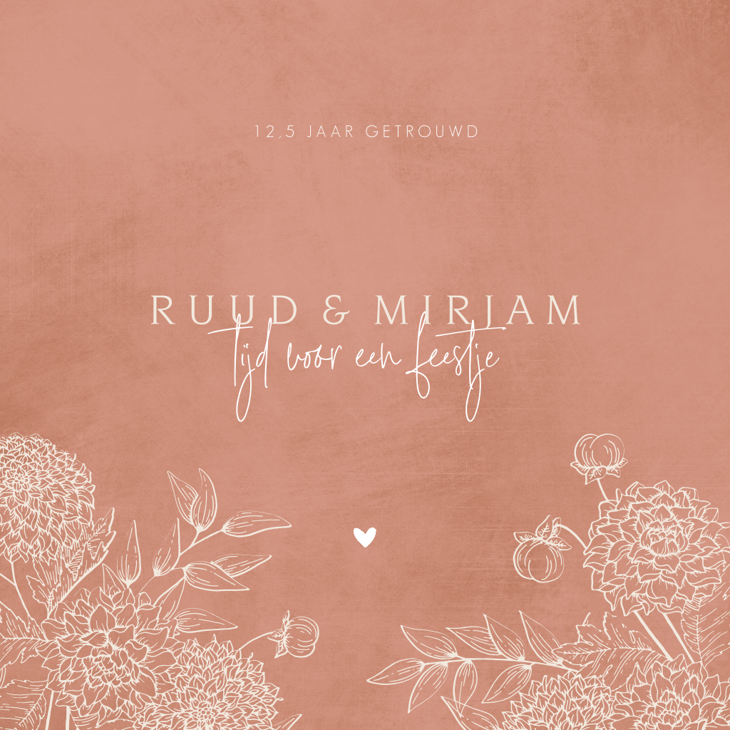 Hippe jubileumkaart voor 12,5 jaar getrouwd. Deze uitnodiging heeft getekende bloemen en sierlijke letters. De gebruikte kleurencombinatie van terra roze, ecru en wit geven deze kaart een warme sfeervolle uitstraling.
