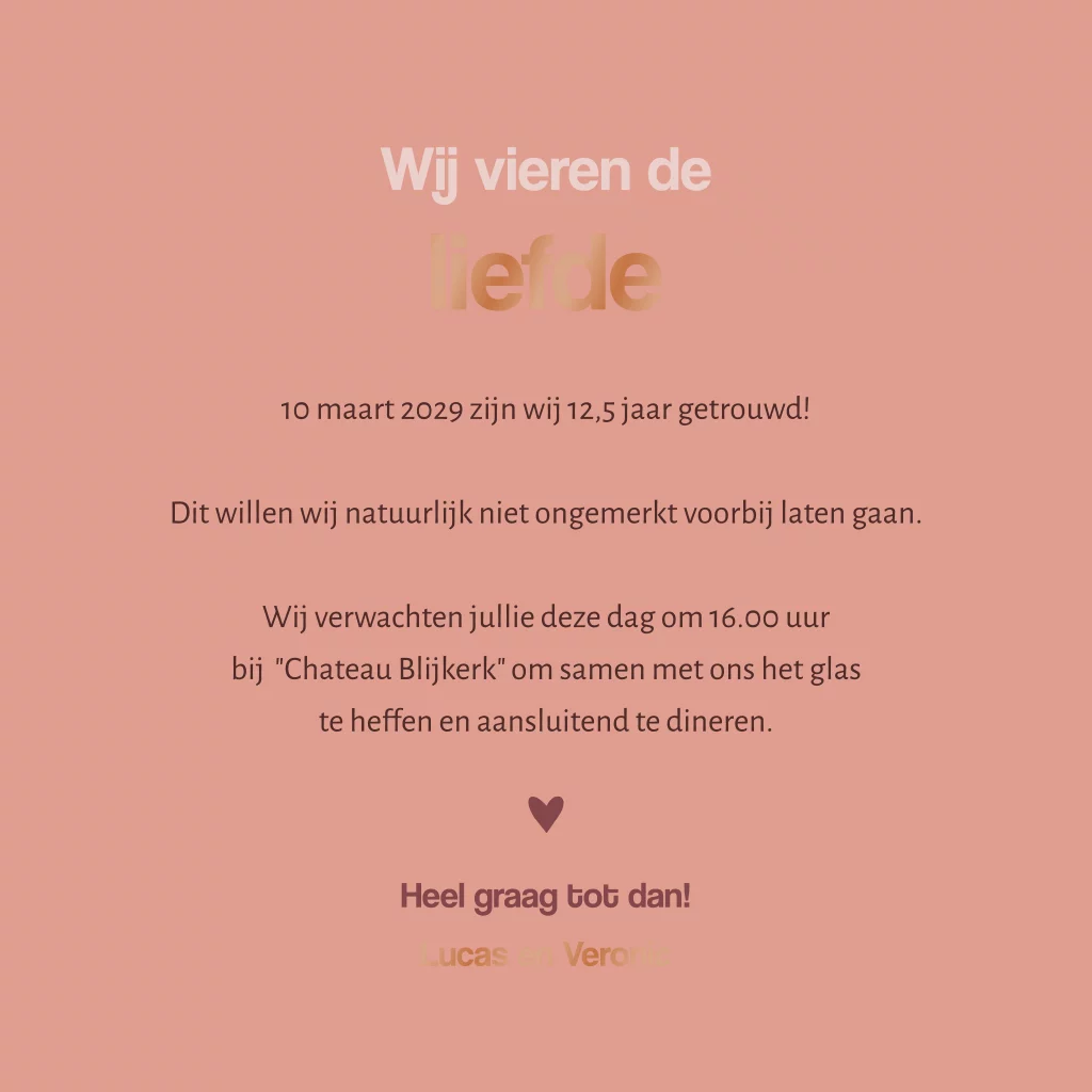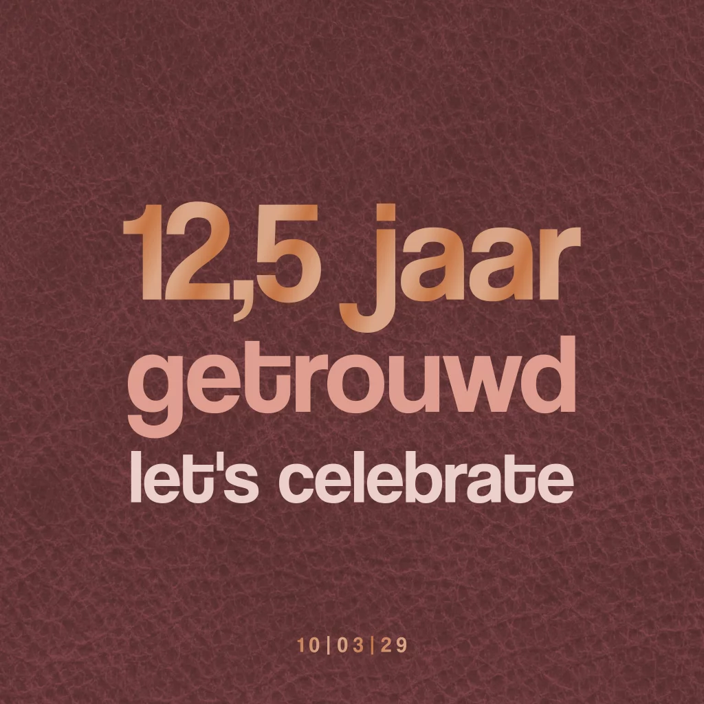"12,5 jaar getrouwd, let's celebrate." Dat staat op deze schitterende uitnodiging voor jullie koperen huwelijk. Deze jubileumkaart heeft afgeronde hoeken, een lederlook achtergrond en elementen in hoogglans. Dat maakt het een luxe kaartje!
