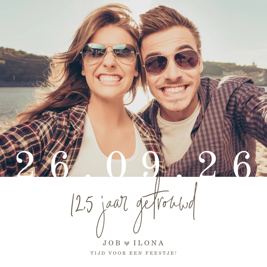 Hippe uitnodigingskaart voor 12,5 jaar getrouwd met eigen foto. Deze jubileum kaart is rustig en clean en geheel naar je eigen wens aan te passen in de editor. Uiteraard ook te gebruiken voor andere bruiloftsjaren.