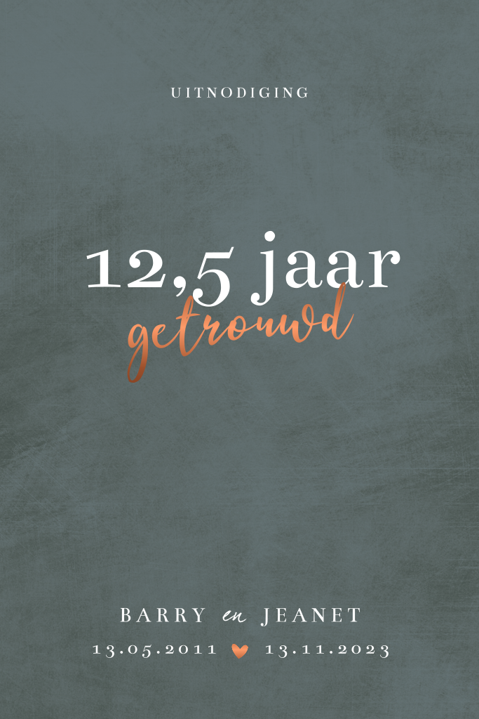 Hippe uitnodigingskaart om jullie 12,5-jarig huwelijk te vieren. Deze jubileumkaart heeft een ruwe donkergroene achtergrond met tekst in wit en koperkleur. Een mooie combinatie. Liever andere kleuren of lettertypes? Dit is gemakkelijk aan te passen in de editor.