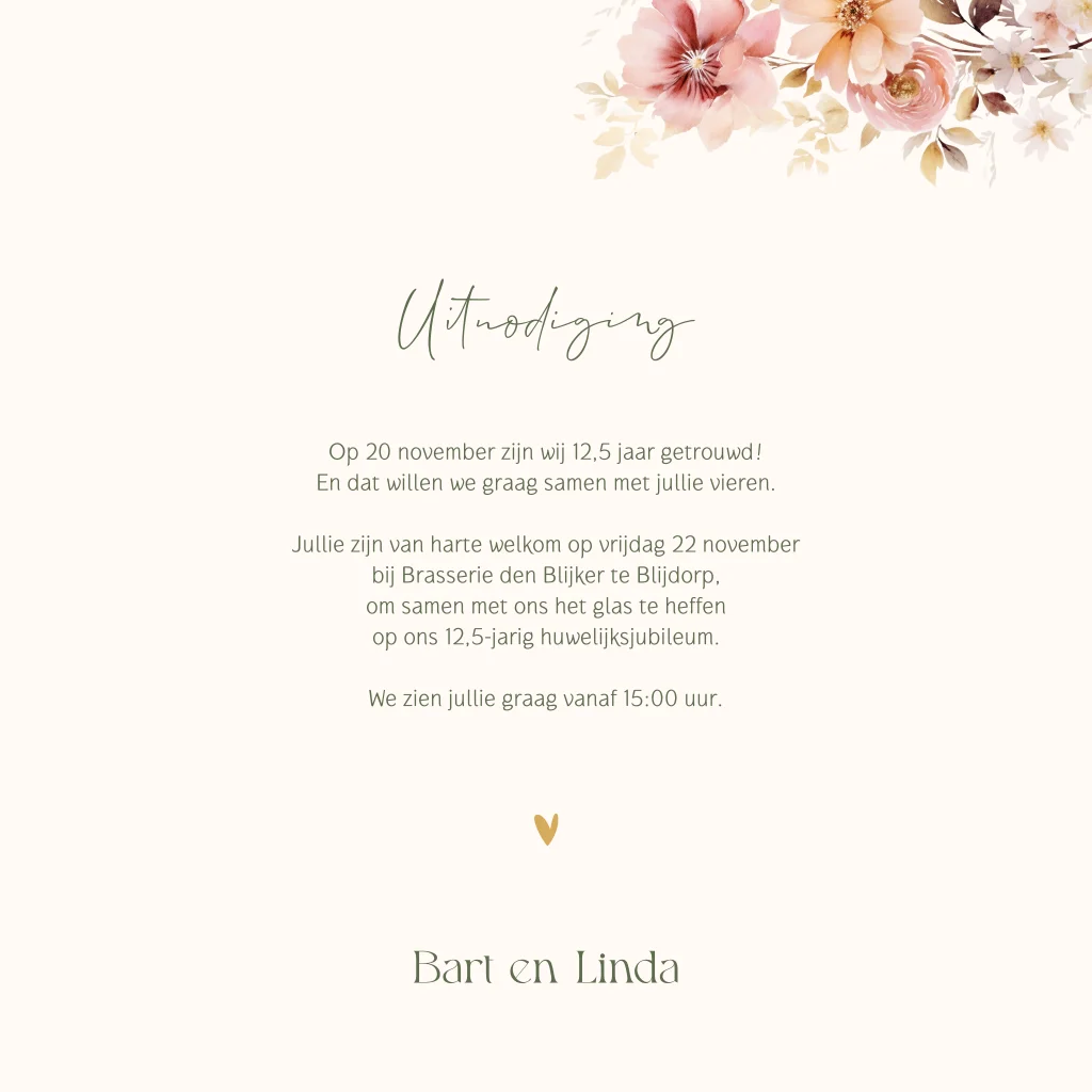 Prachtige jubileumuitnodiging voor als je wilt vieren dat jullie 12,5 jaar getrouwd zijn. Op deze jubileum uitnodiging zie je een romantische bloemenkrans met jullie namen erin en hoeveel jaar jullie getrouwd zijn. Pas de teksten eenvoudig aan in de editor. Hulp nodig bij het ontwerpen? Neem contact met ons op!