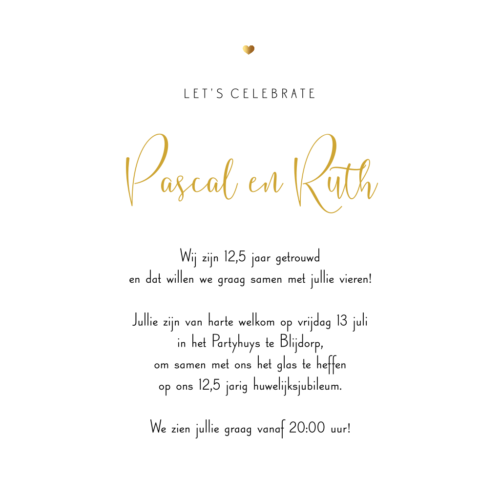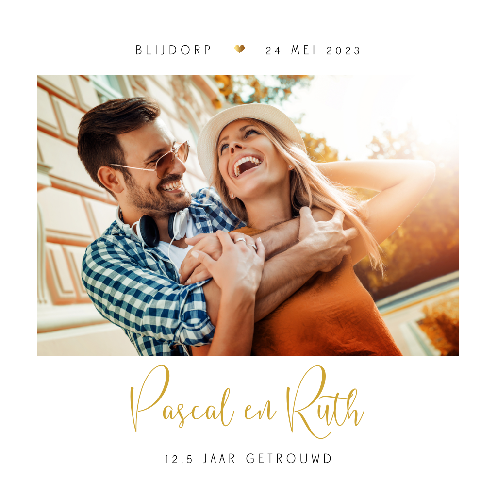 Rustige jubileumkaart met sierlijke goudkleurige letters en gouden hartje. Deze uitnodiging voor 12,5 jaar getrouwd is rustig en daardoor stijlvol en tijdloos. Op de kaart plaats je gemakkelijk jullie eigen foto.