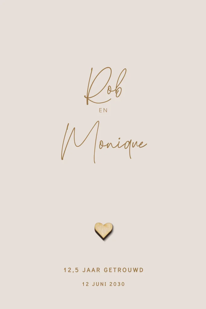 Een eenvoudige trendy jubileumkaart met een echt houten hartje. Deze jubileumuitnodiging voor 12,5 jaar getrouwd heeft een basic design maar het houten hartje maakt deze kaart helemaal exclusief. Teksten en kleuren zijn makkelijk aan te passen in onze editor.