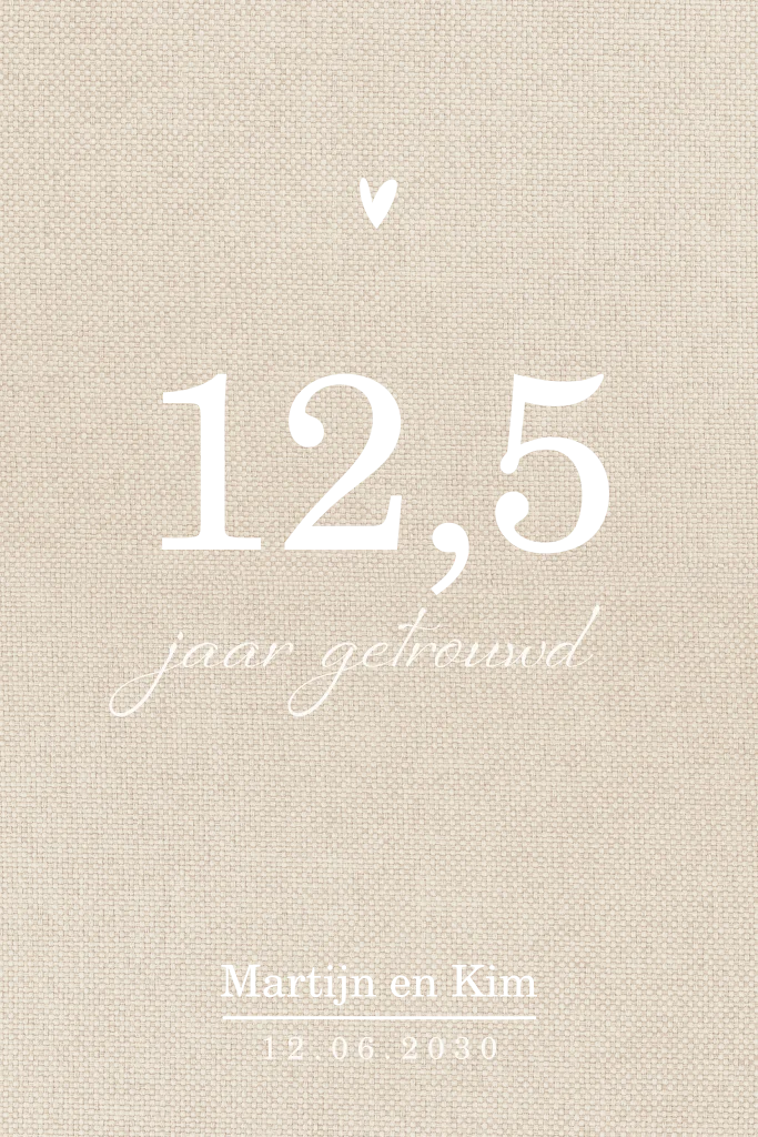 Jubileumkaart in beige linnenlook met luxe glanzende goudfolie. Deze jubileumuitnodiging voor 12,5 jaar getrouwd heeft een rustige uitstraling maar is toch stijlvol door de zachte kleurencombinatie van beige met wit en goud. De afgeronde hoeken maken het wat minder strak. Verstuur de uitnodigingen in een mooie witte envelop met gouden inlay voor een complete look.