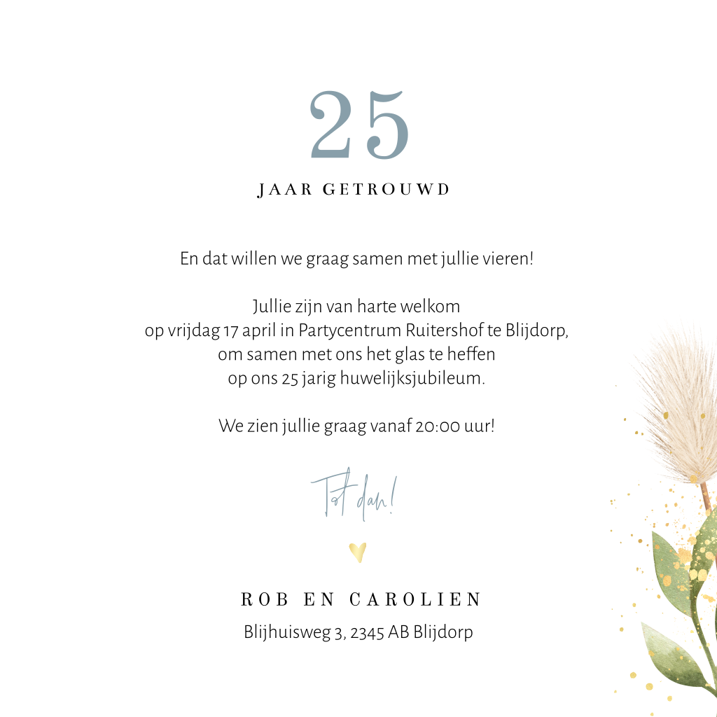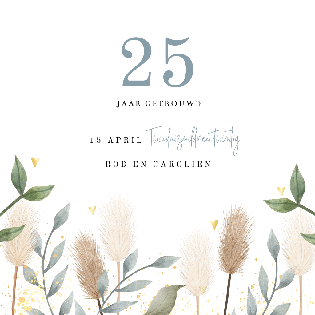Hippe jubileumkaart voor 25 jaar getrouwd. Op deze uitnodiging staan trendy droogbloemen en goudkleurige hartjes. Deze kaart is ook te gebruiken voor een ander jubileum jaar, de teksten zijn gemakkelijk aan te passen.