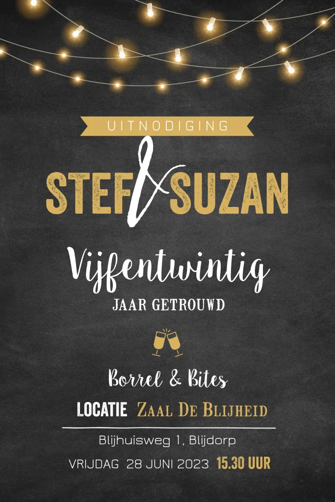 Uitnodiging 25 jaar getrouwd met krijtbord en lampjes