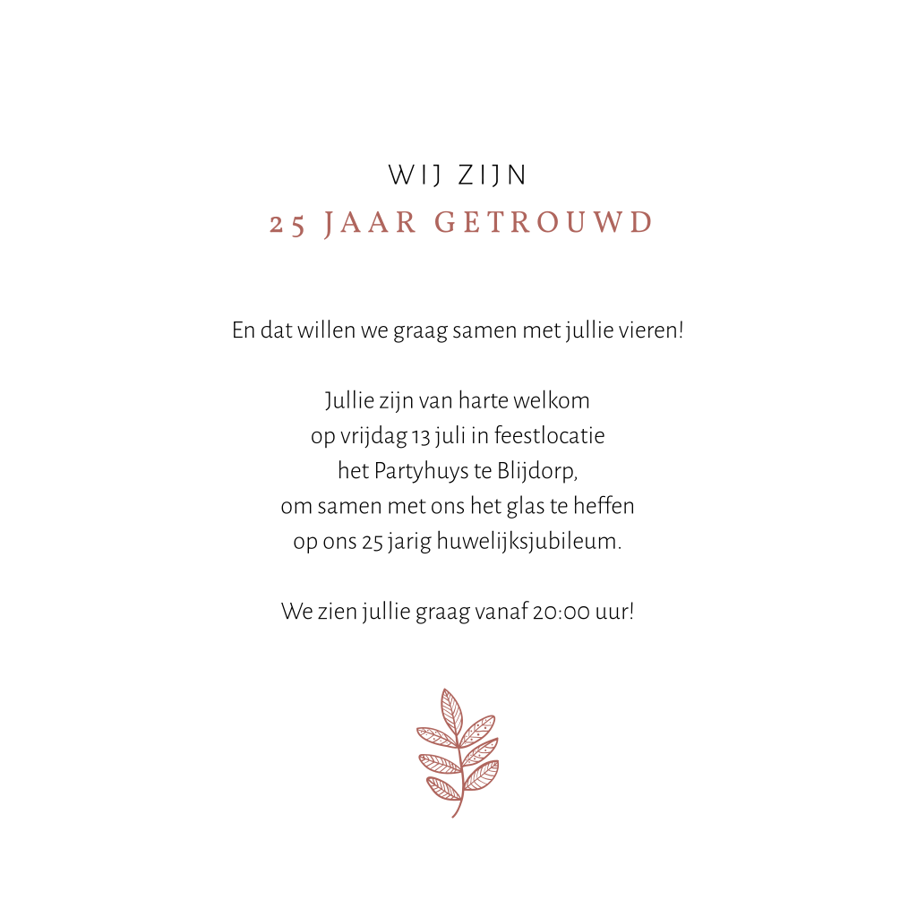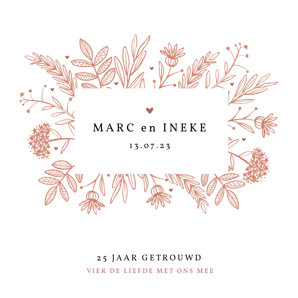 Romantische jubileumkaart voor 25 jaar getrouwd op een witte achtergrond. Op de voorzijde zie je een bloemenkrans van zacht roze rozen en groene blaadjes. deze bloemen komen aan de binnenkant van deze huwelijksjubileum kaart terug.