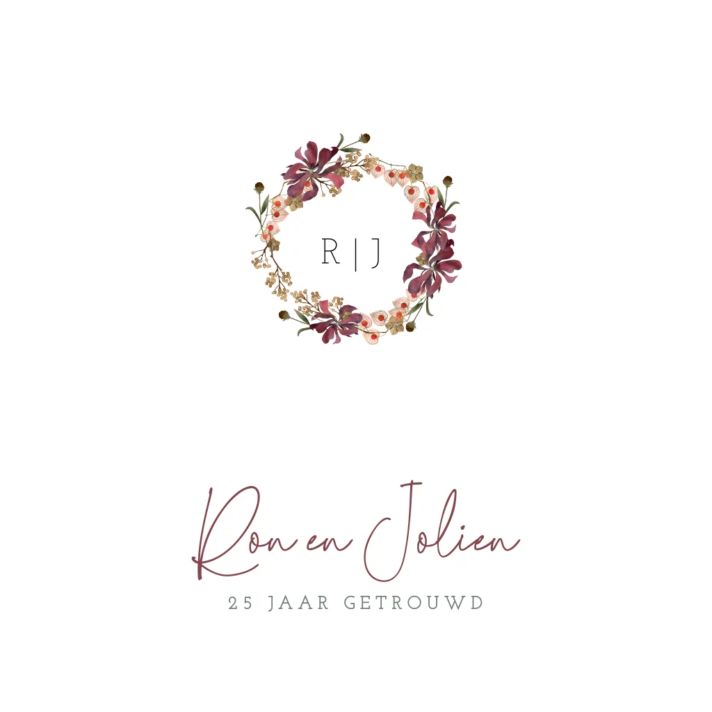 Stijlvolle 25 jaar getrouwd uitnodiging met bloemenkrans op een witte achtergrond. Deze kleurencombinatie maakt de kaart heel chique.