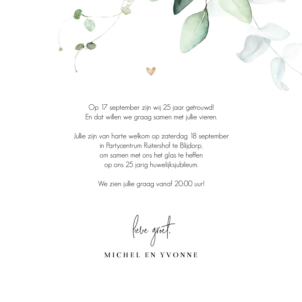 Botanische jubileumkaart met een rustige uitstraling. Op deze uitnodiging voor 25 jaar getrouwd staan mooie aquarel eucalyptus takjes in zachte groene tinten. Pas de teksten en lettertypes naar je eigen smaak aan in de editor. Ook geschikt voor andere bruiloftsjaren.