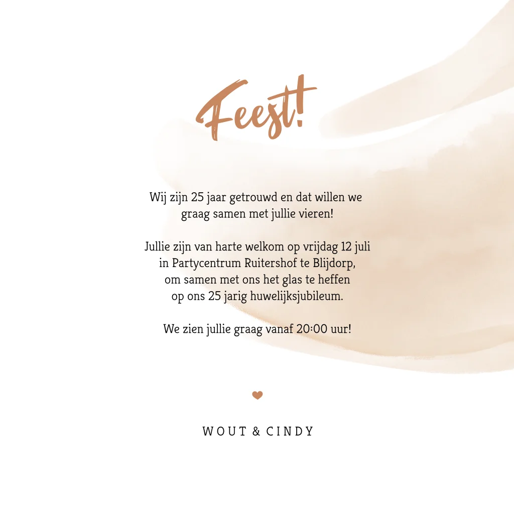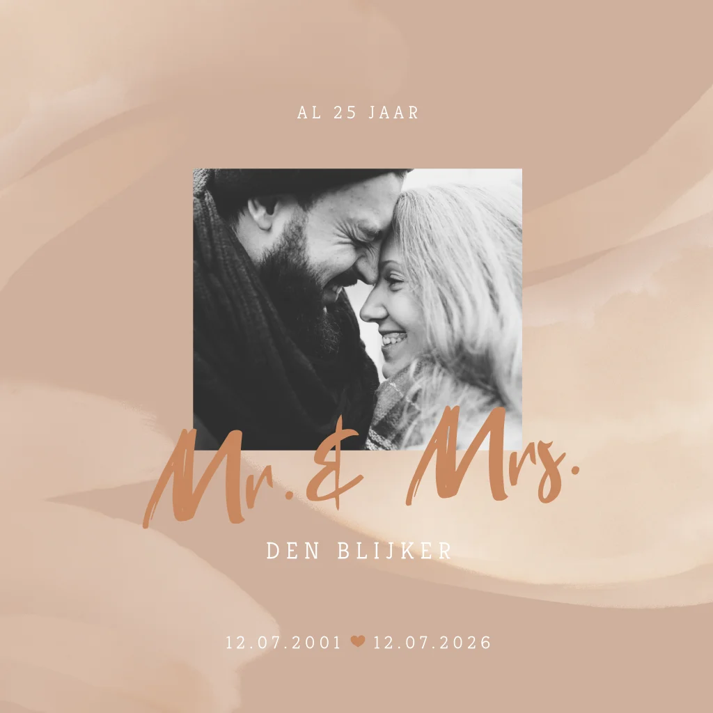 Deze jubileumkaart voor 25 jaar getrouwd heeft warme natuurlijke kleuren, helemaal dé trend van nu. Op deze uitnodiging staat de tekst "al 25 jaar Mr & Mrs" en voeg je een eigen foto toe. De aquarel vegen geven een mooi effect. Deze kaart kun je zelf aanpassen in de editor.
