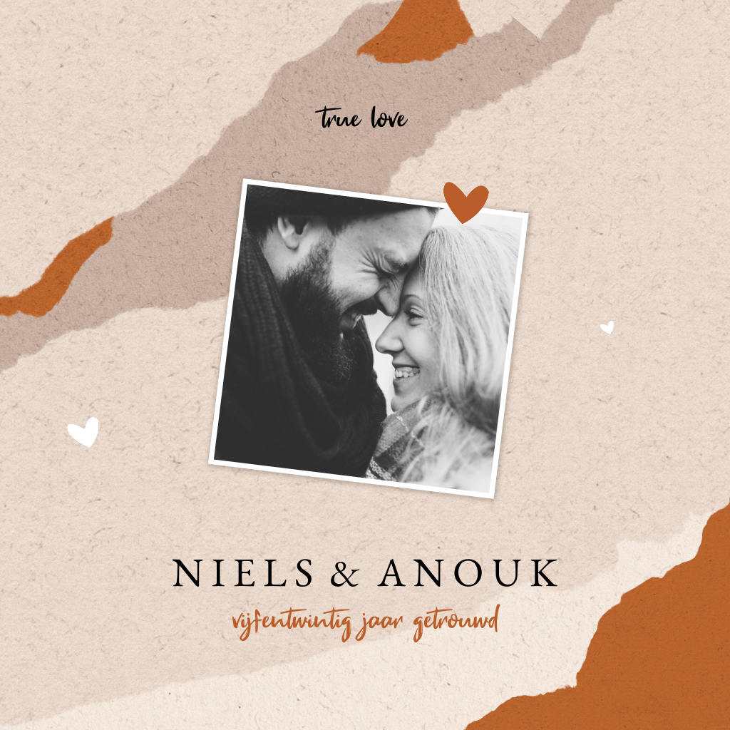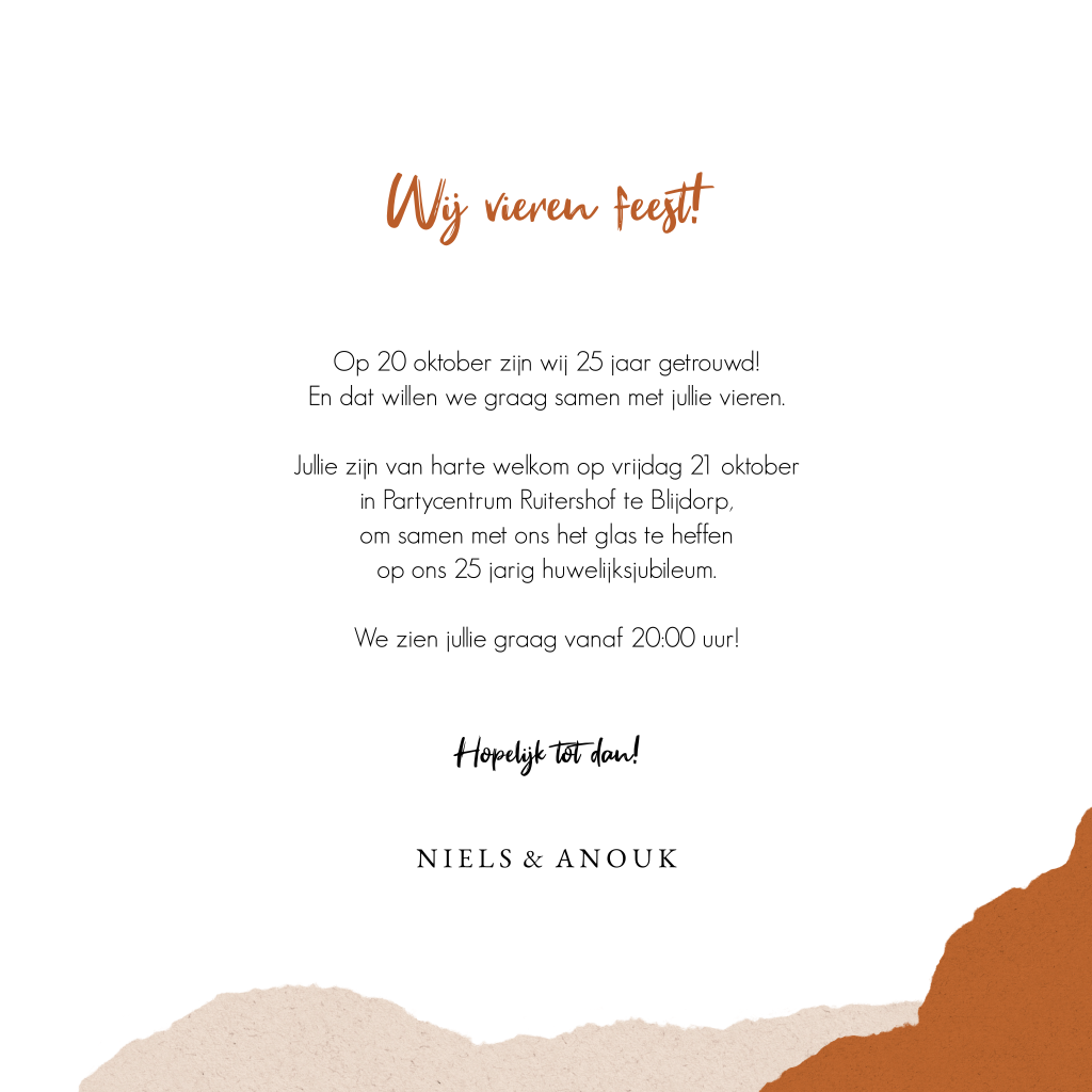 Uitnodigingskaart voor 25 jaar getrouwd met op de achtergrond verschillende lagen karton in trendy kleuren, wat ook wel oogt als gescheurd papier. Voeg een eigen persoonlijke foto toe. Deze jubileumkaart kan ook gebruikt worden voor andere bruiloftsjaren. Pas de kaart naar je eigen wensen aan in de editor.