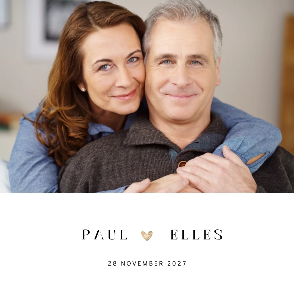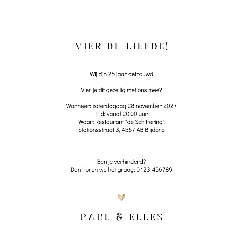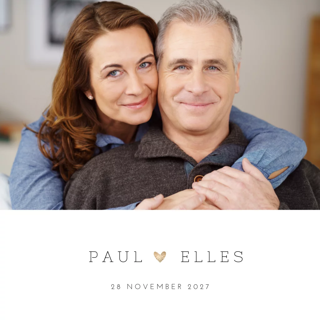 Rustige foto jubileumkaart om te vieren dat jullie 25 jaar getrouwd zijn. Deze uitnodiging is overwegend wit met een klein goudkleurig hartje en ruimte voor een grotere foto. Onder de foto jullie namen in een strak lettertype, met tussen de namen een klein goudkleurig hartje. Pas deze kaart naar je eigen smaak aan in de editor en combineer met een mooie envelop om het helemaal af te maken.