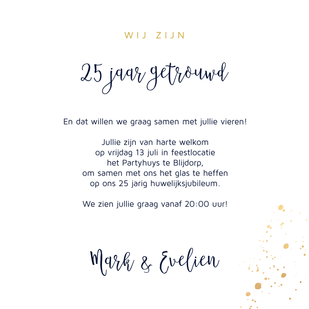Stijlvolle 25 jaar getrouwd uitnodiging met eigen foto en goudkleurige geometrische lijnen. De lijnen met goudtinten vormen een mooie combinatie met het donkerblauwe vlak en kader. Deze jubileumkaart heeft sierlijke letters, wat de kaart een chique uitstraling geeft.