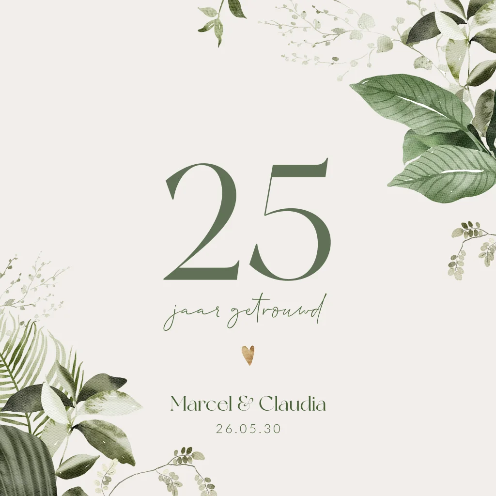 Jubileumkaart met botanische bladeren om te vieren dat jullie 25 jaar getrouwd zijn en een feestje geven. Deze jubileumkaart heeft een beige achtergrond met groene botanische bladeren. Het gouden hartje geeft een romantische touch. Pas de kaart geheel naar eigen wens aan in de editor. Vragen? Laat het ons weten!