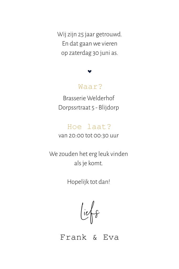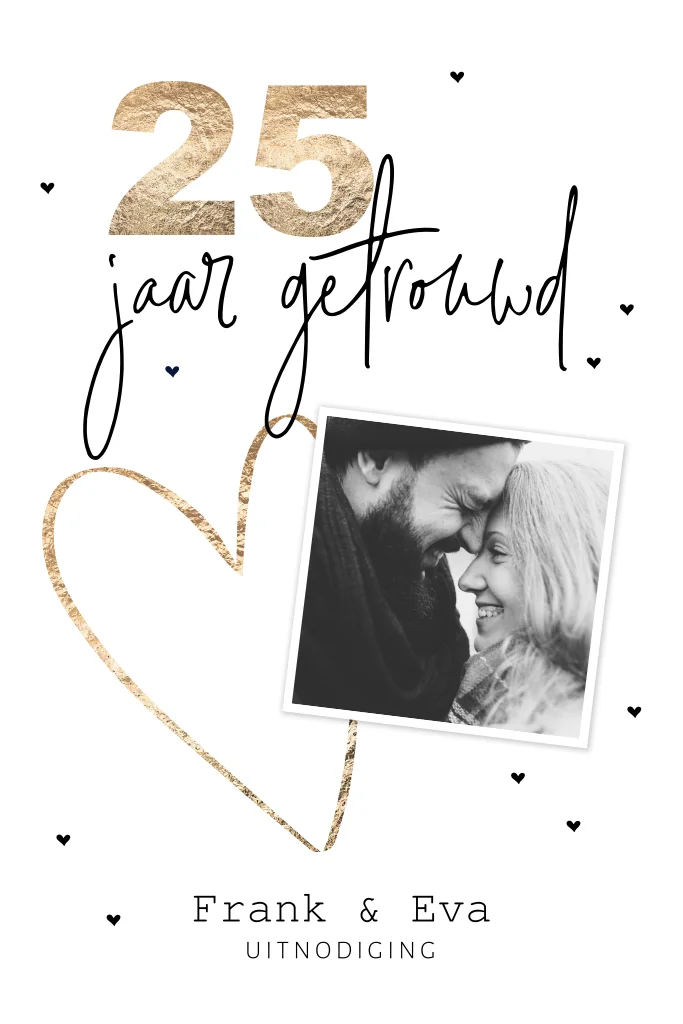 Hippe uitnodiging voor een 25-jarig huwelijk. Op deze jubileumkaart staat jullie eigen foto omringd door kleine hartjes. De gebruikte kleuren zijn zwart- wit met goud. Dit is naar je eigen smaak aan te passen in de editor.