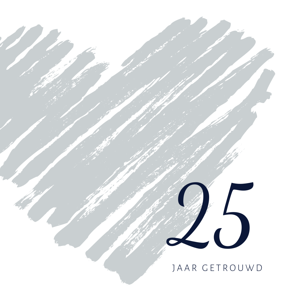 Mooie jubileumkaart voor 25 jaar getrouwd, een zilveren bruidspaar. Het grote zilvergrijze hart geeft de kaart een chique uitstraling. Deze kaart is tijdloos en het aantal huwelijksjaren is gemakkelijk aan te passen. Het gekraste grijs zilveren hart is een echte sierlijk chique combinatie.